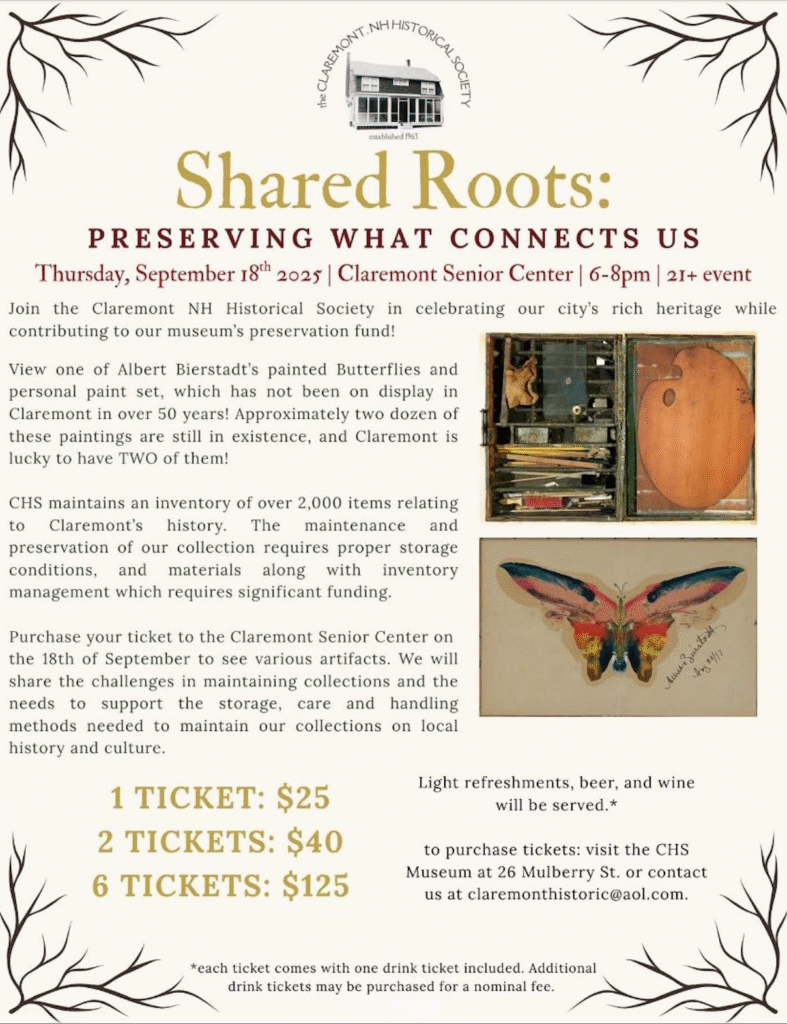 Join Claremont, NH Historical Society in an exclusive opportunity to celebrate our city’s rich heritage, while contributing to the Museum’s preservation fund! Tickets can be purchased through a Board of Trustee Member, purchased at the Museum, or arranged through contacting us at – claremonthistoric@aol.com.